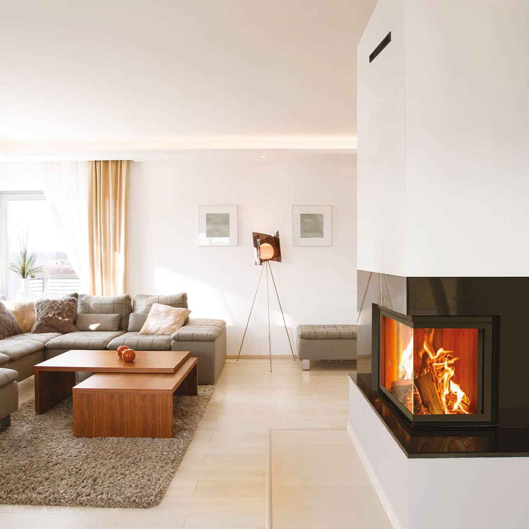 Monoblocco vetro angolare dotato di mantello convettivo integrato. Camera di combustione in ghisa. Anta saliscendi a chiusura ermetica. Funzionamento a convezione naturale integrabile con kit di ventilazione AIRclima+.