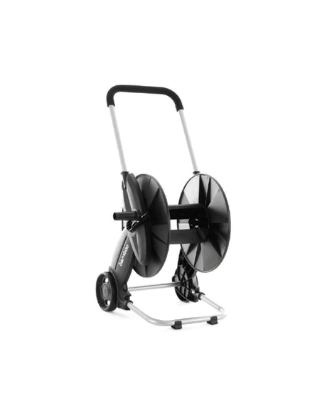 Telaio in alluminio, tamburo in materiale plastico ad alta resistenza, maniglia richiudibile, impugnatura antiscivolo, 2 ruote, fermapiede, manovella. Alluminio antiruggine ad alta resistenza e lunga durata. Capacità: 1/2>60 mt | 5/8>50 mt.