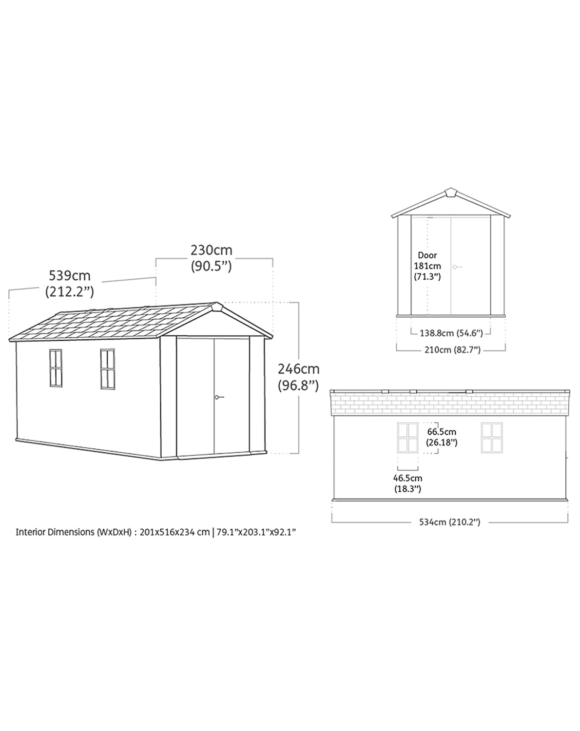 Dimensioni casetta: 539 x 230 x 246h cm