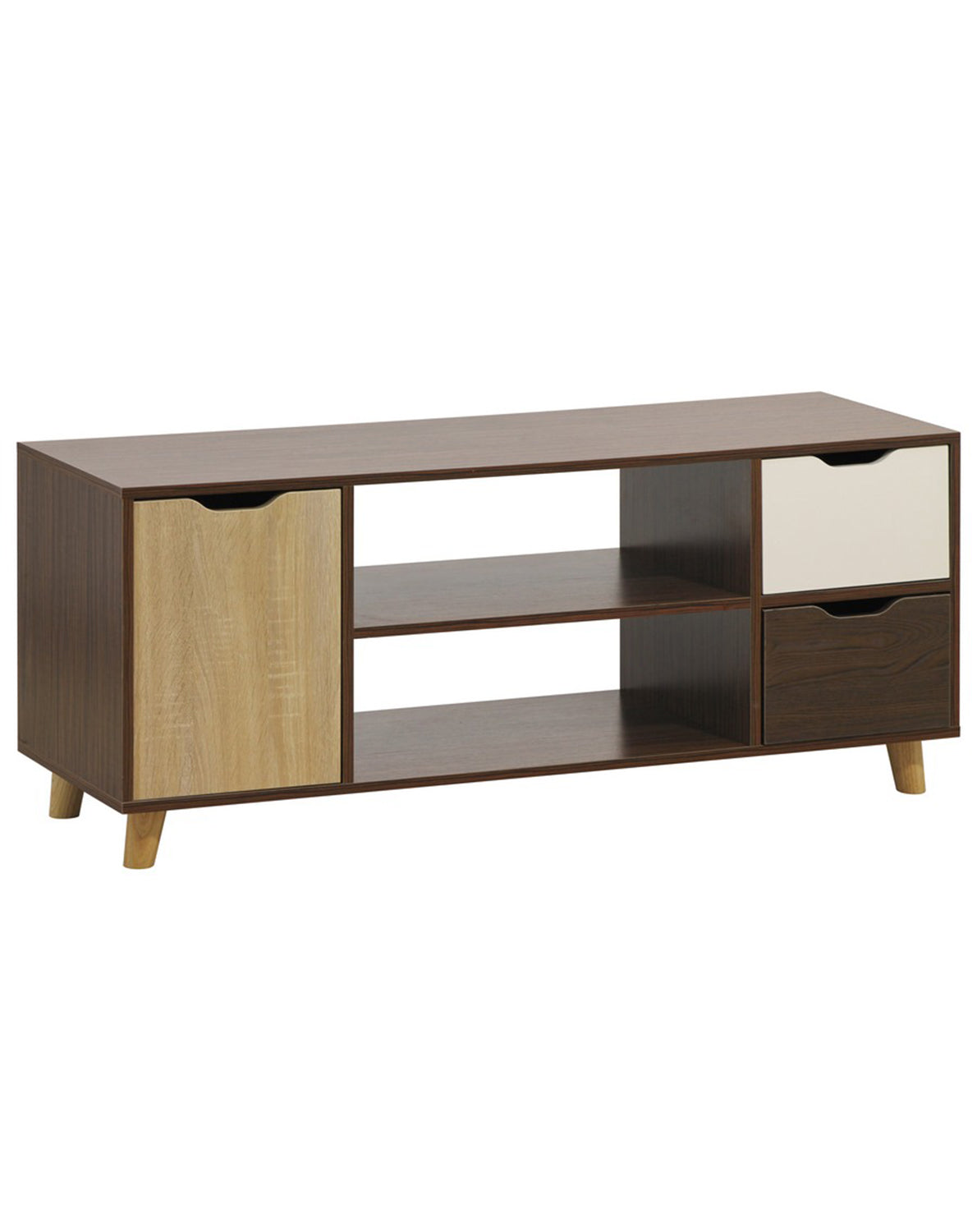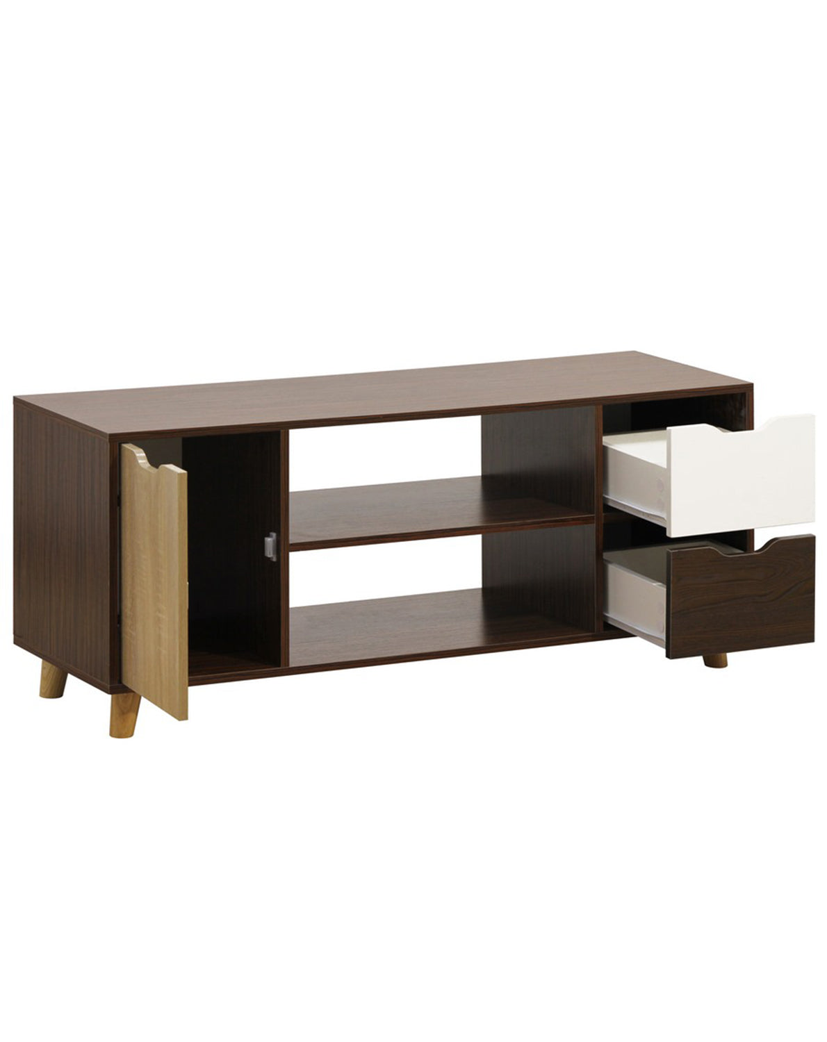 Mobiletto moderno con due ripiani e due cassetti. Maniglie a scomparsa. Struttura in legno melaminico spessore 15 mm effetto zebrano, un'anta (faggio), un cassetto (rovere scuro), un cassetto (bianco opaco).