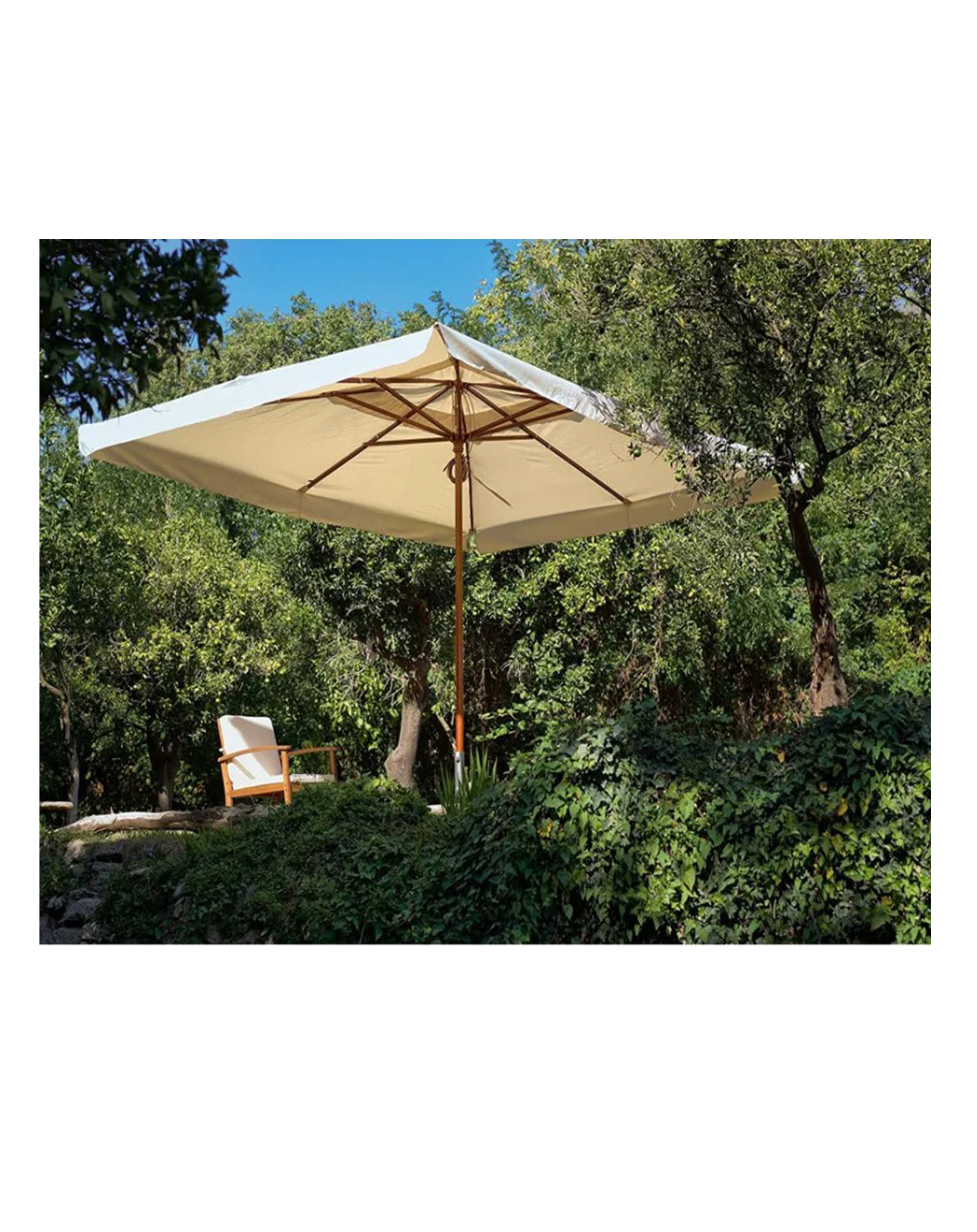 Palo centrale in legno diametro 48 mm con finitura tinta olio, 8 stecche 20 x 28 mm. Telo in poliestere 250 g/m2 di colore écru, con trattamento idrorepellente scotchgard resistente all'acqua, allo sporco e traspirante. Camino antivento e volant. Base in cemento non inclusa. Misure ingombro esterno: L. 300 cm x P. 300 x H. 270 cm. Altezza interna sotto al parasole 200 cm.