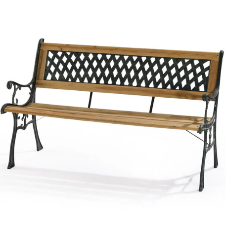 Panchina in ghisa e legno con schienale in plastica effetto ghisa.
