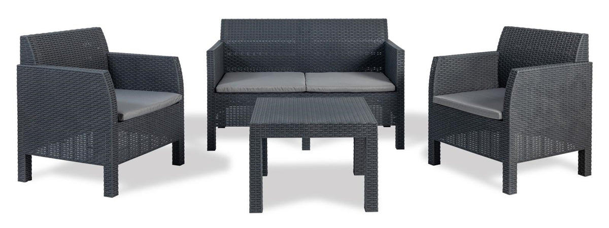 Set di 2 poltrone con cuscini, 1 divano con 2 sedute con cuscini e 1 tavolo da giardino.