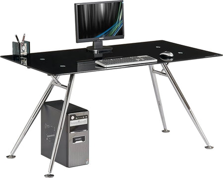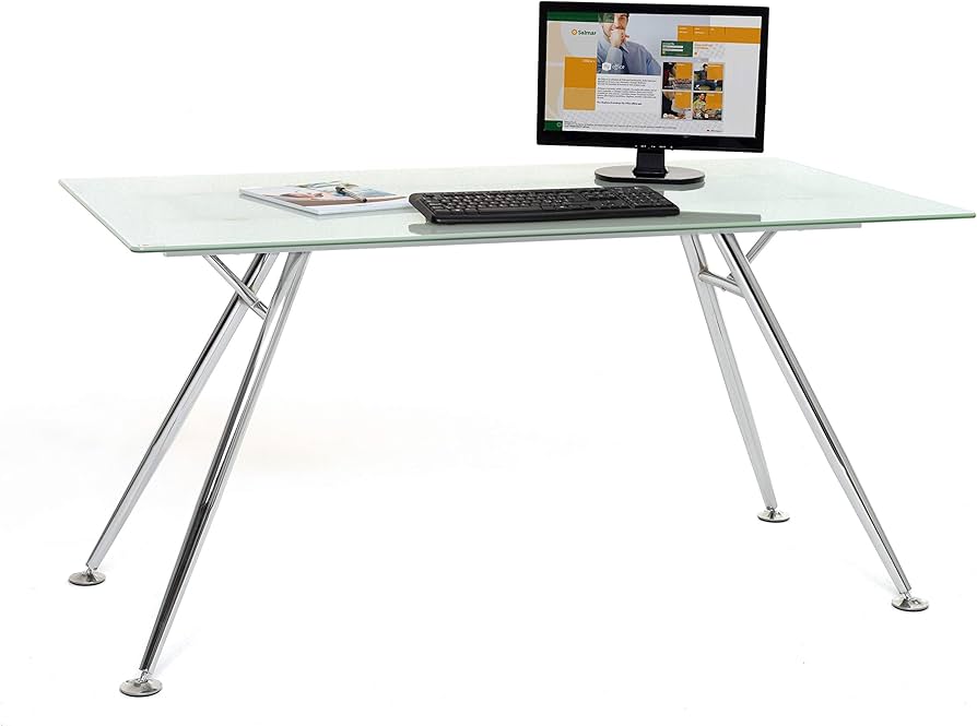 Scrivania con struttura in acciaio cromato, piano in vetro temperato 8mm.