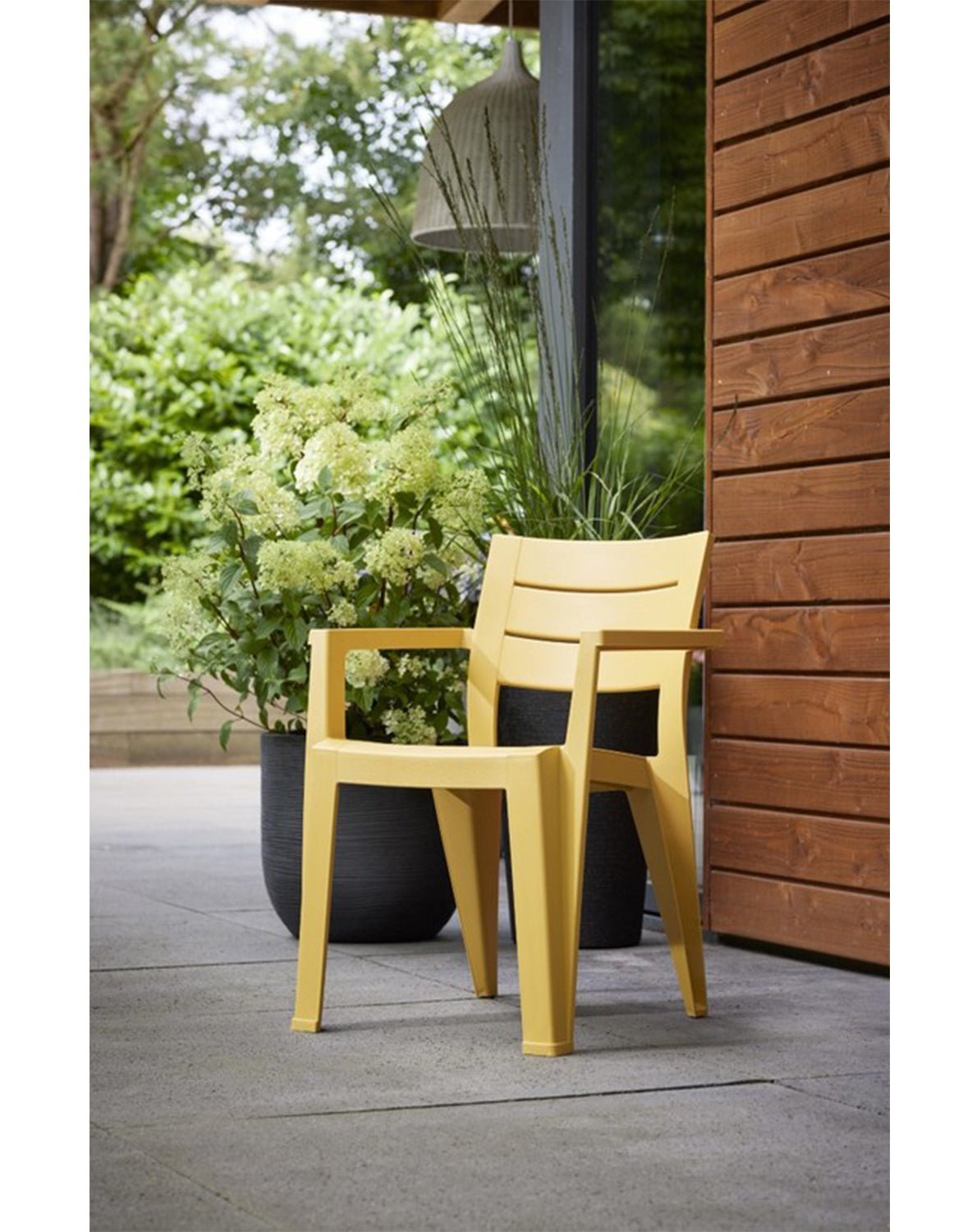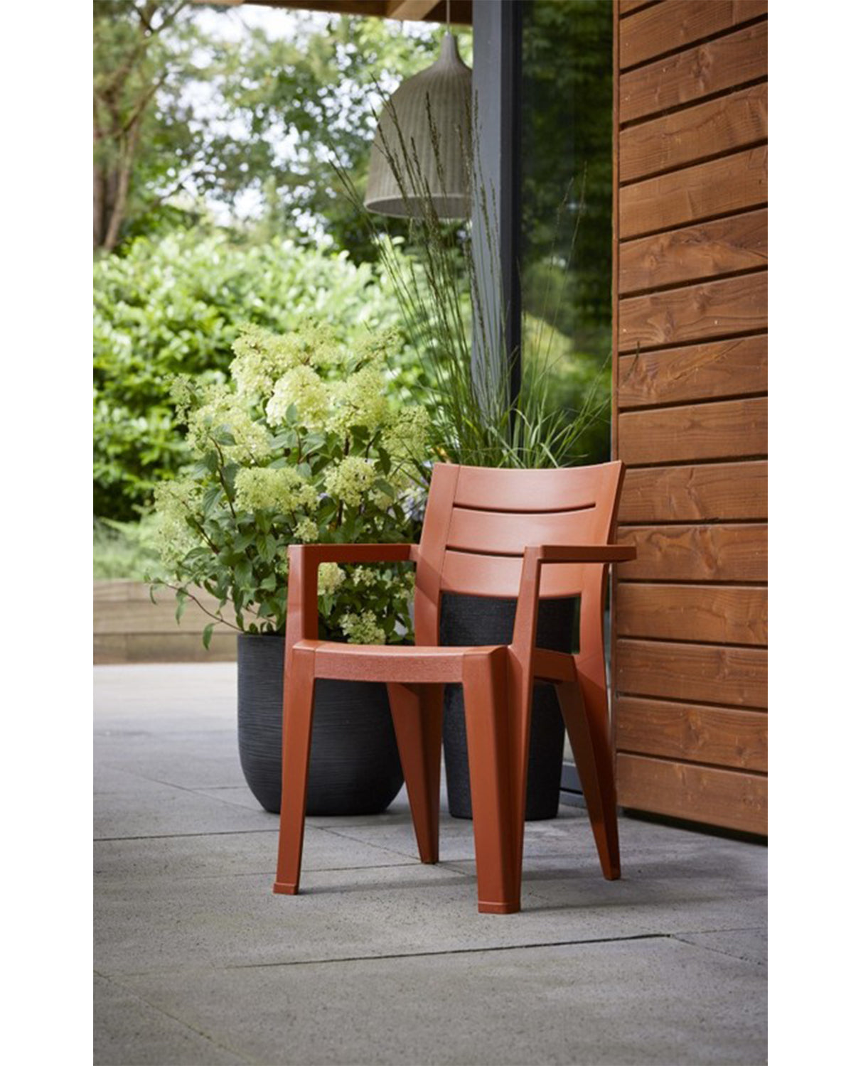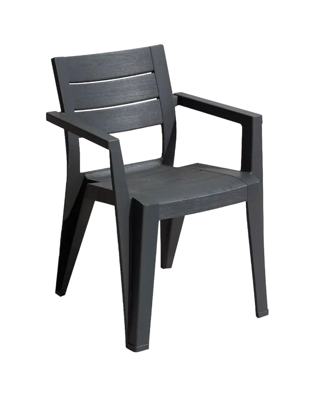 Design moderno ed elegante con seduta ergonomica dotata di braccioli. Resiste agli agenti atmosferici. Si adatta con facilità a molti modelli di tavolo.