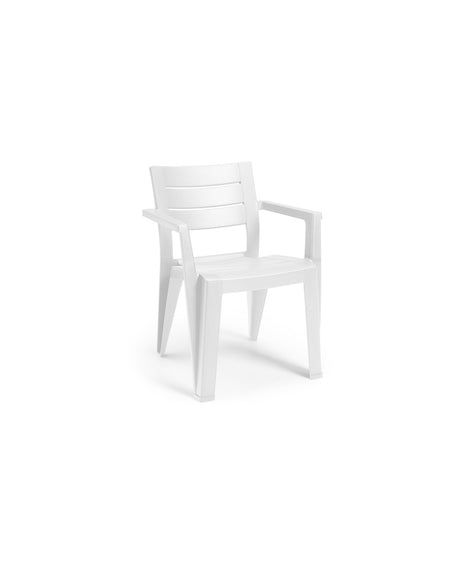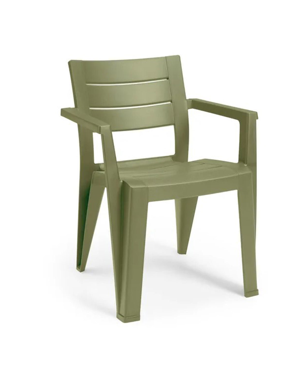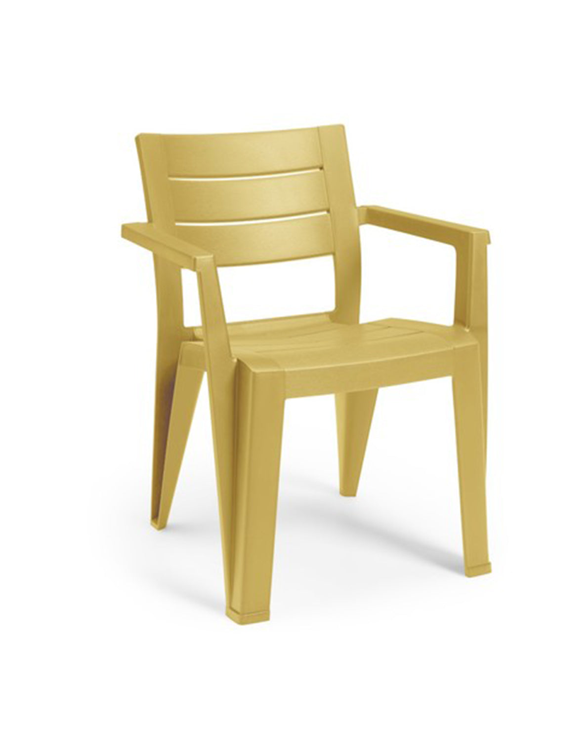 Design moderno ed elegante con seduta ergonomica dotata di braccioli. Resiste agli agenti atmosferici. Si adatta con facilità a molti modelli di tavolo.