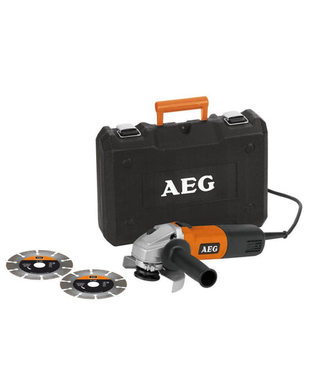 Smerigliatrice fornita con impugnatura addizionale, flangia, dado per flangia, carter, due dischi diamantati e valigetta.