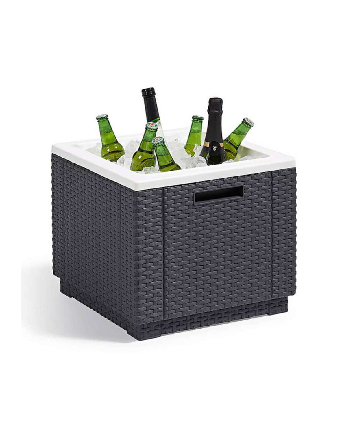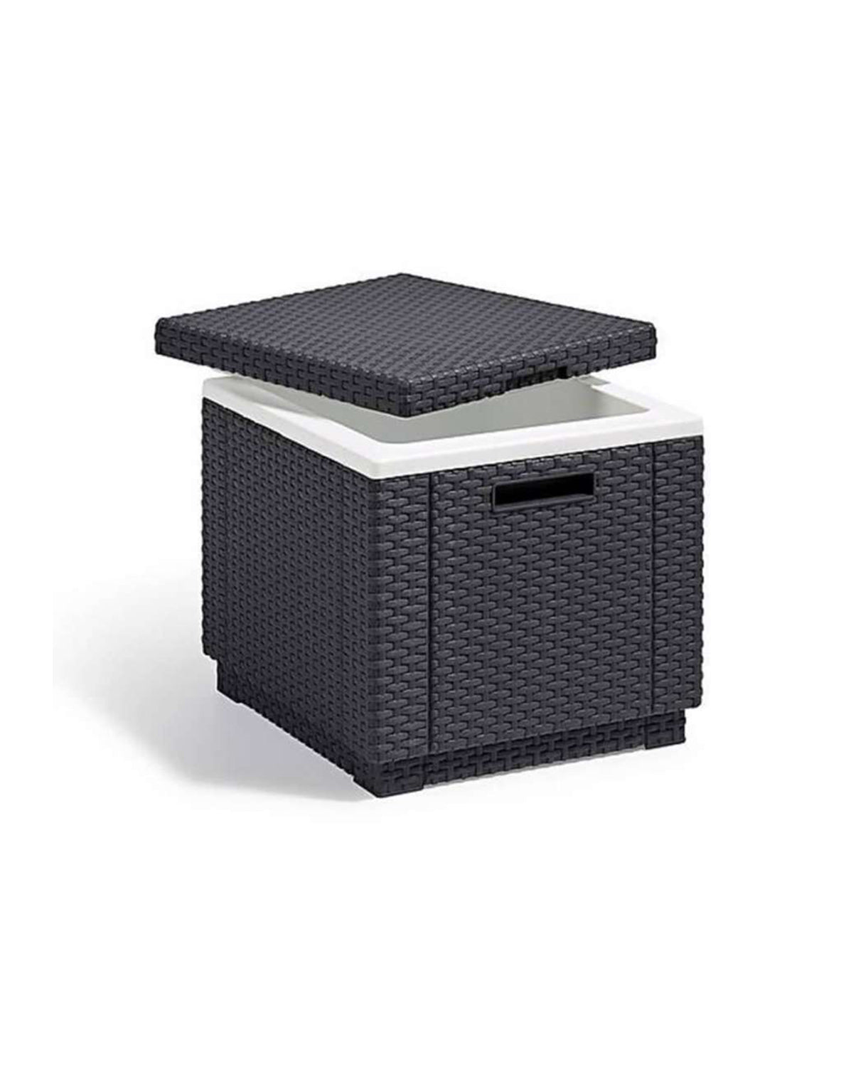 Tavolino contenitore con funzione portaghiaccio. Leggero e dotato di maniglie per un agevole trasporto. Realizzato con materiale resistente e durevole, che riproduce la finitura del rattan. Puoi utilizzarlo anche come sgabello, tavolino o poggiapiedi.